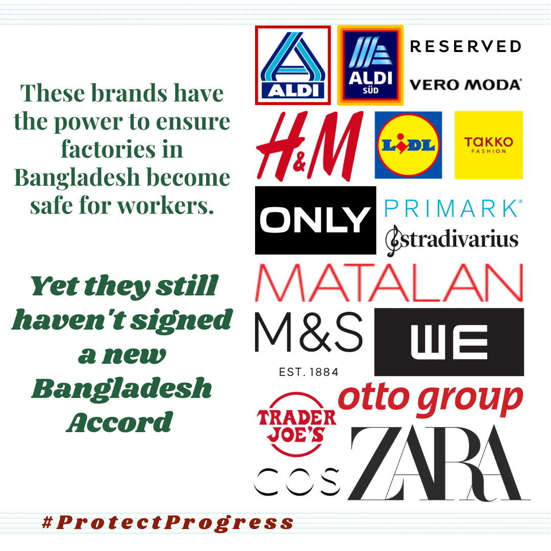 Het Bangladesh-akkoord houdt op te bestaan als er geen nieuwe overeenkomst wordt getekend. Ondanks hun beweringen dat zij de veiligheid van kledingarbeiders belangrijk vinden hebben merken als Aldi, C&A, H&M, Next en Primark zich niet uitgesproken voor voortzetting van de maatregelen. Het nalaten hiervan is in strijd met hun zorgplicht op het gebied van mensenrechten. In Frankrijk bestaat sinds 2017 wetgeving om deze zorgplicht voor grote bedrijven af te dwingen, en in Duitsland is zulke wetgeving in een vergevorderd stadium.