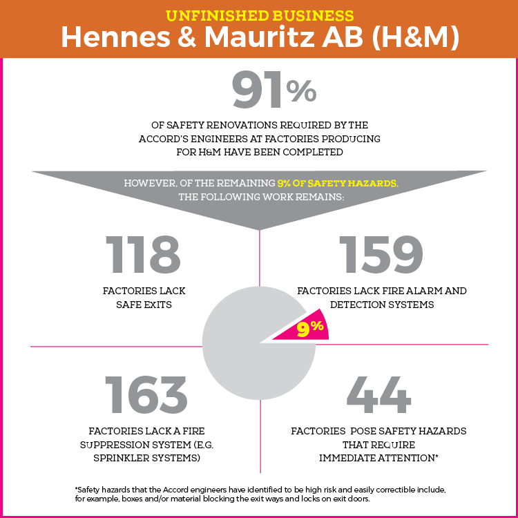 Het rapport laat ook zien dat er in fabrieken die vallen onder de akkoord-afspraken, nog veel niet-opgeloste problemen zijn die urgent moeten worden aangepakt. In fabrieken die produceren voor onder meer C&A, H&M, Tommy Hilfiger, WE en Zeeman, lopen kledingarbeiders nog steeds aanzienlijke veiligheidsrisico’s door het ontbreken van brandalarmsystemen en veilige nooduitgangen.