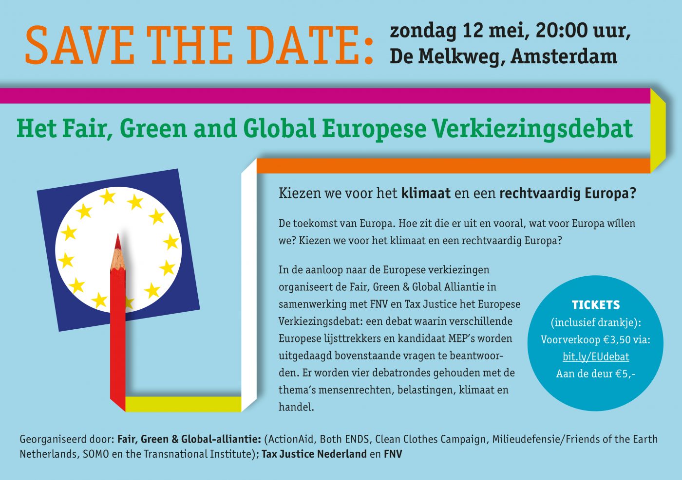 De toekomst van Europa. Hoe ziet die er uit? En vooral, wat voor Europa willen we? Kiezen we voor het klimaat en een rechtvaardig Europa? In de aanloop naar de Europese parlementsverkiezingen organiseert de Fair, Green and Global Alliantie in samenwerking met Tax Justice, Handel Anders! en FNV het Europese Verkiezingsdebat: een debat waarin verschillende Europese lijsttrekkers en kandidaat-Europarlementariërs worden uitgedaagd bovenstaande vragen te beantwoorden.