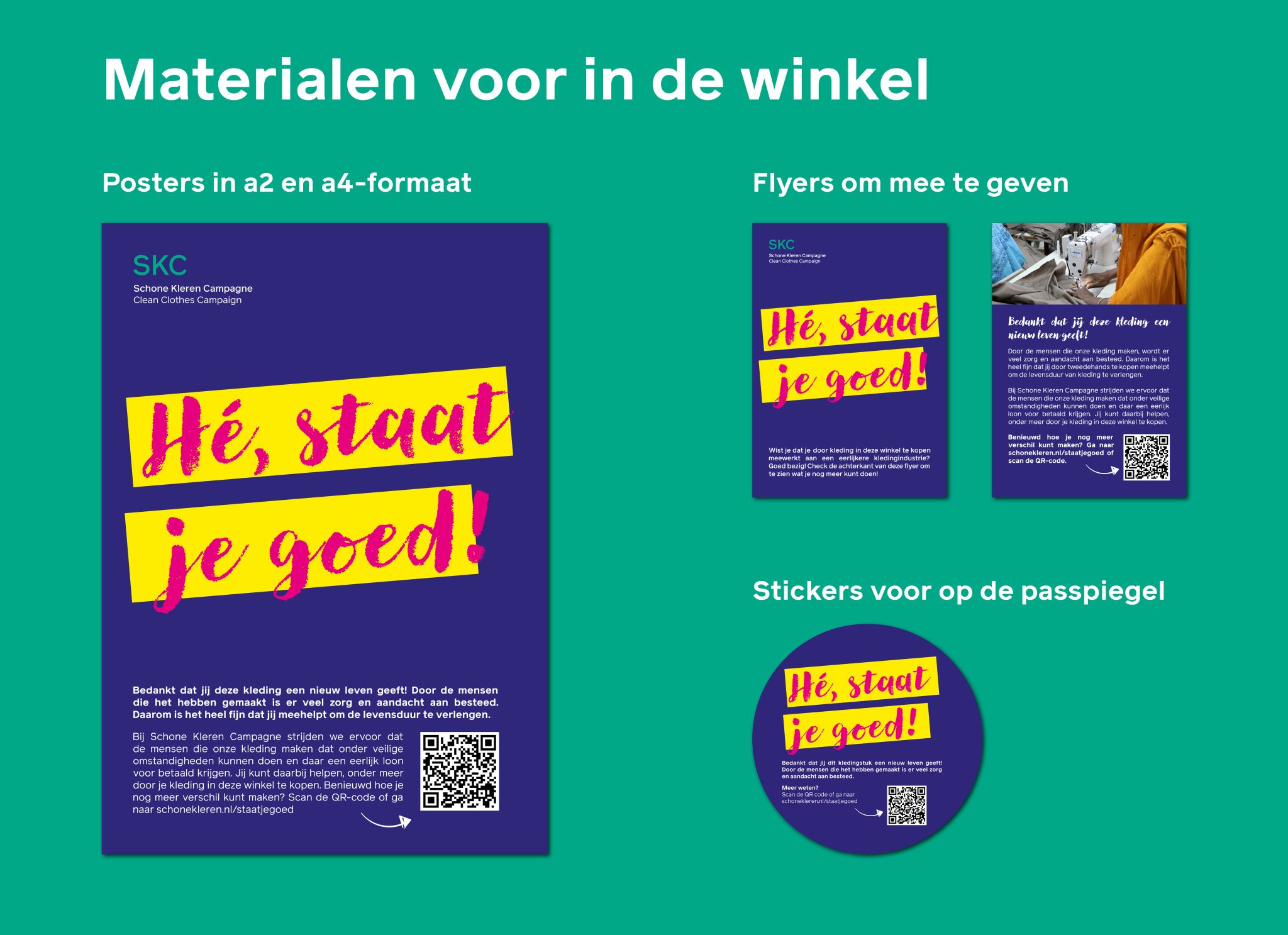 We hebben verschillende materialen beschikbaar: een poster in a2- en a4-formaat om op te hangen in de winkel, een flyer die je aan klanten kunt meegeven na een aankoop en een sticker voor op de paskamerspiegel.